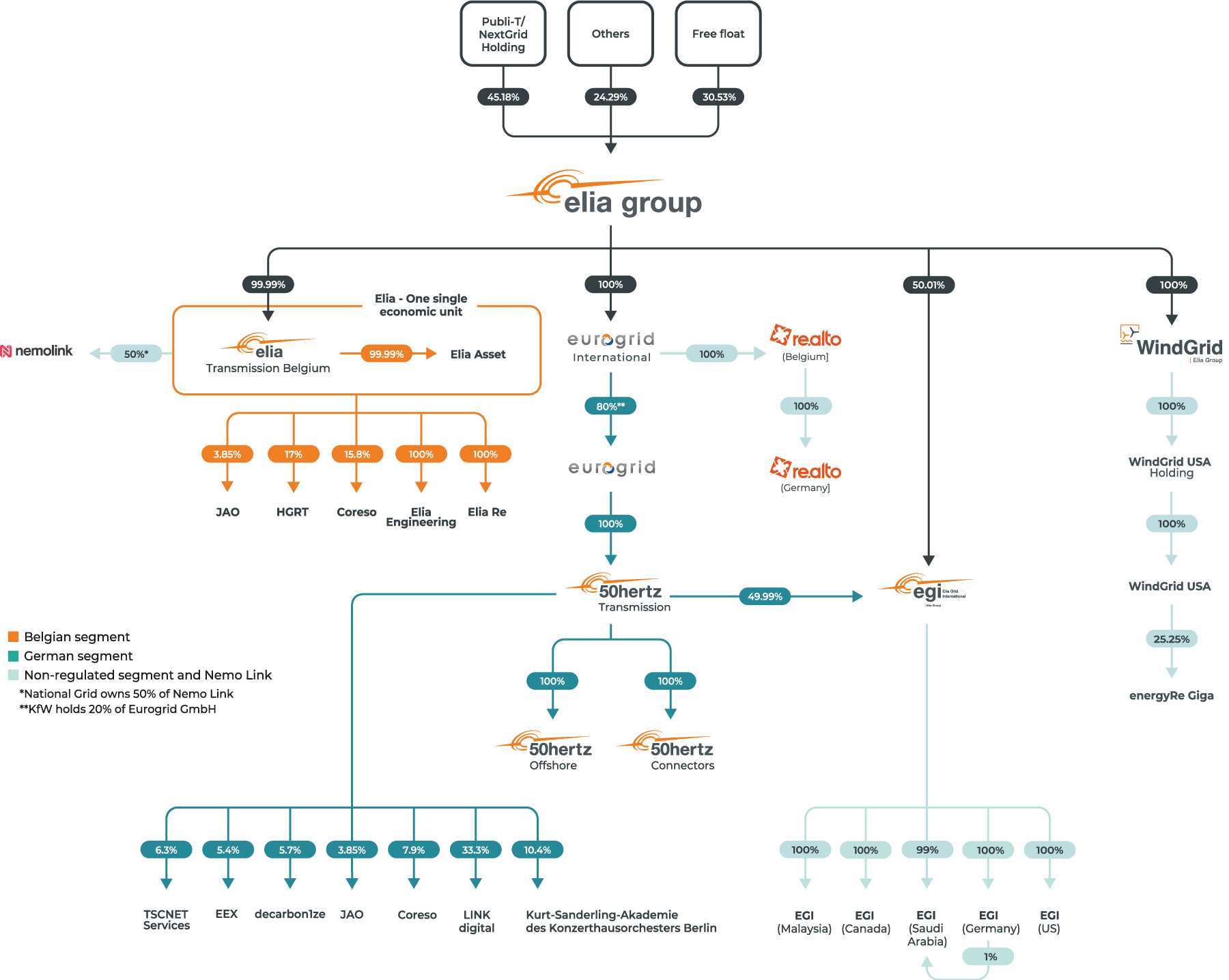 Elia Group acts as a holding company that owns Elia Transmission Belgium (the Belgian TSO), Eurogrid International (comprising the activities of 50Hertz, the German TSO) and Elia Grid International (the Group’s international consultancy branch). Its main shareholder is NextGrid Holding. Elia Group (formerly Elia System Operator SA/NV) has been listed on the regulated market of Euronext Brussels since June 2005.